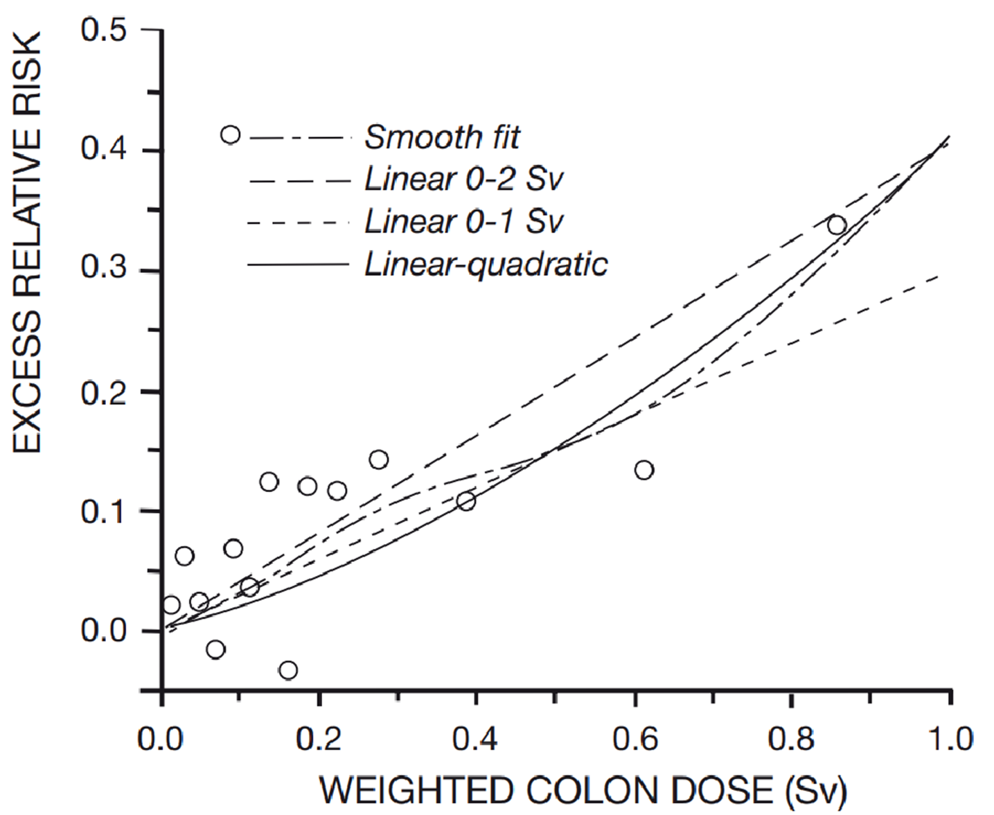 25. 委員会は疫学データを用いて、被曝線量と癌発症リスクの関係、すなわち線量反応関係を検証した。過剰相対リスクとは、特定の線量における放射線被曝が研究対象集団に及ぼす癌リスク増加の度合いを示す指標である(数値が大きいほどリスクが高いことを示す)。日本の原爆被爆者データ(全固形癌の合計)がこの関係性を最も明確に示しており、図IIに示されている。図IIに示す低線量域における死亡率の線量反応関係は、直線関数と曲線関数の両方で記述可能である。統計的に有意なリスク上昇は100~200mGy以上の線量で観察される。疫学研究のみでは、これらよりはるかに低い線量域におけるリスクの有意な上昇を特定することは困難である。(以下省略)