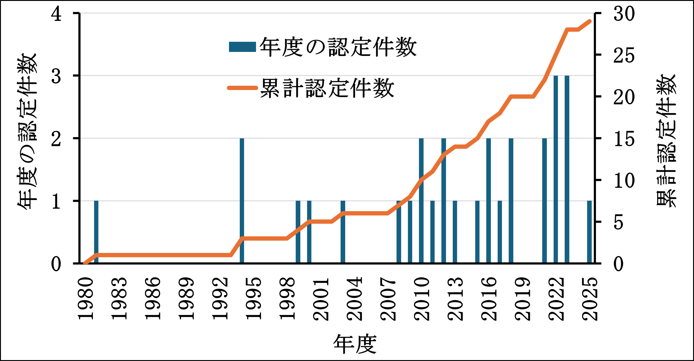 原発被ばく労働者の電離放射線被ばくによる疾病の労災補賞としては29件目で、その推移を図1に示します。近年は労災認定の頻度が増加傾向にあります。