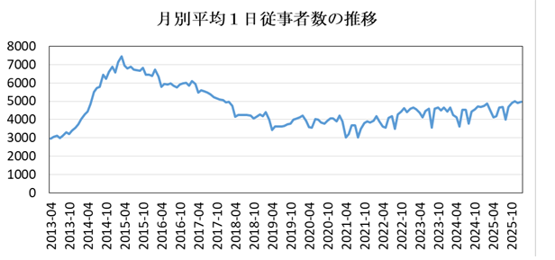 その後減少傾向が続いた後、2019年4月~2022年3月は7000人前後で推移した。 2022年3月以降、増加傾向が続いている。