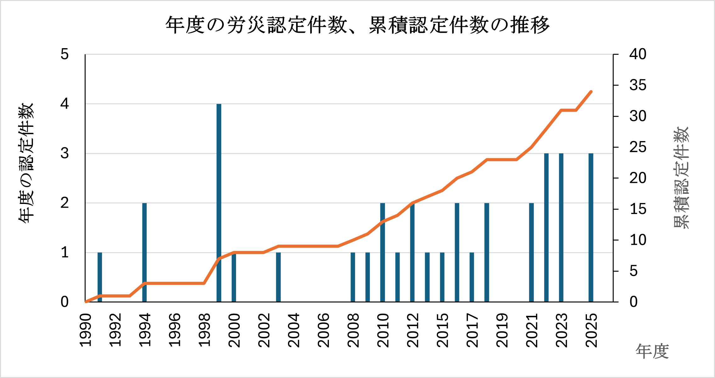 労災補償件数の推移 2025年10月現在、累積34件が労災認定されています。